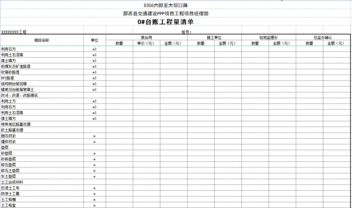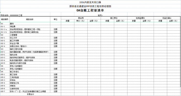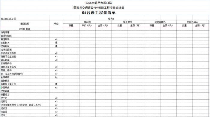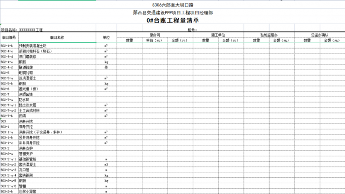 一個項目或一個合同段的臺賬由n條可以獨立計量的工程結(jié)構(gòu)(單元)組成,一般情況下一條臺賬應包含子目號、子目名稱、單位、工程數(shù)量、單價、合價、里程樁號、工程部位描述、圖紙編號、備注說明等。