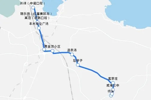 橋頭、橋頭稅務、威海三中、孟家莊、后亭子、溫泉湯、黃金頂小區(qū)、江家寨、豐禾商業(yè)廣場、蒿泊、韓樂坊、長峰,共12站。