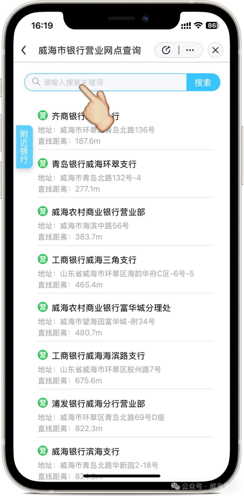 進(jìn)入“愛山東”APP后,在首頁左上角選擇進(jìn)入“威海市”,在搜索框搜索關(guān)鍵詞“銀行營業(yè)網(wǎng)點”,點擊進(jìn)入應(yīng)用。