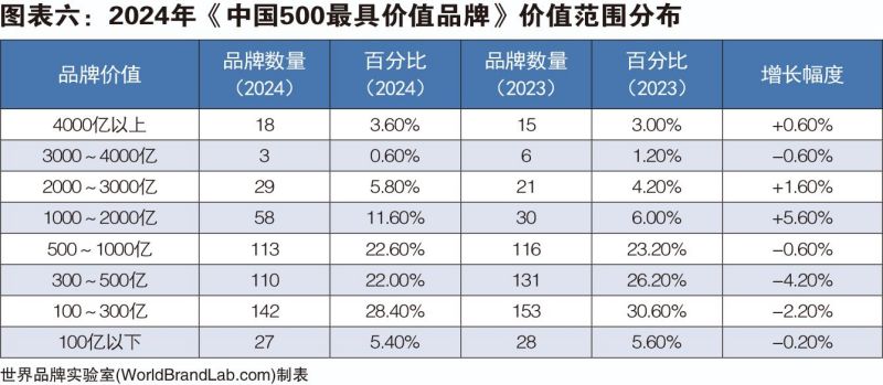 2024年《中國(guó)500最具價(jià)值品牌》的總價(jià)值為38.57萬(wàn)億元,比去年增加4.24萬(wàn)億元,增幅為12.35%。世界品牌實(shí)驗(yàn)室學(xué)術(shù)委員會(huì)主席、牛津大學(xué)(Oxford)營(yíng)銷學(xué)榮譽(yù)教授斯蒂芬·沃格(Steve Woolgar) 博士表示:“在過(guò)去的20多年中,我目睹了中國(guó)品牌的快速成長(zhǎng),有的已經(jīng)具有強(qiáng)大的世界影響力,這些品牌包括國(guó)家電網(wǎng)、海爾、中化、華潤(rùn)、中國(guó)南方電網(wǎng)、保利、河鋼、中國(guó)華電、五糧液、徐工、青島啤酒、中國(guó)國(guó)航、北大荒、東方電氣、通威、波司登、飛鶴、中國(guó)航油、恒力、協(xié)鑫、圣象、九牧、長(zhǎng)虹、雙星輪胎等?!笔澜缙放茖?shí)驗(yàn)室編制中國(guó)品牌報(bào)告已是第21個(gè)年頭,2004年入選門(mén)檻僅為5億元,前500名品牌的平均價(jià)值為49.43億元。21年以后的2024年,入選門(mén)檻已經(jīng)提高到38.26億元,而前500名品牌的平均價(jià)值高達(dá)771.40億元,增幅為1460.59%。本年度共有108個(gè)中國(guó)品牌的價(jià)值超過(guò)1000億,比去年增加36個(gè),彰顯了中國(guó)品牌經(jīng)濟(jì)的繁榮。